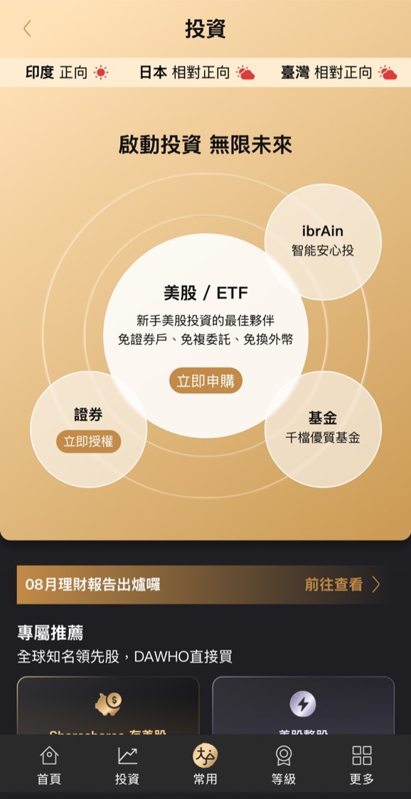 永豐銀行近年的數位創新,也正是基於這種市場意識。2020 年永豐銀行攜手永豐金證券推出「DAWHO x 大戶投」,打造業界首創的「一次申辦」流程:用戶僅需一站申請,就能同時完成數位帳戶與證券戶的開立,並直接進入數位交易體驗。後續更進一步優化服務,讓用戶能在DAWHO App 上查看所有資產,甚至獲得個人化的理財報告。