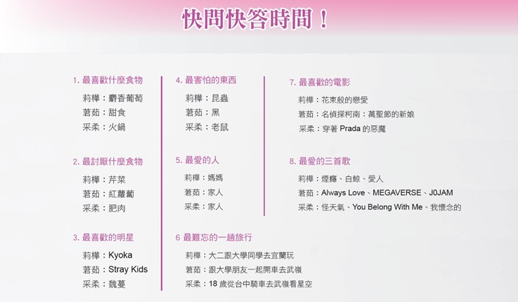 采柔:大學是最沒有後顧之憂可以做自己想做的事的時候,真的要好好把握。盡量去做那些你有興趣的事,享受這個過程。每個舞台都是經驗的累積,也會讓你遇到很多意想不到的夥伴。